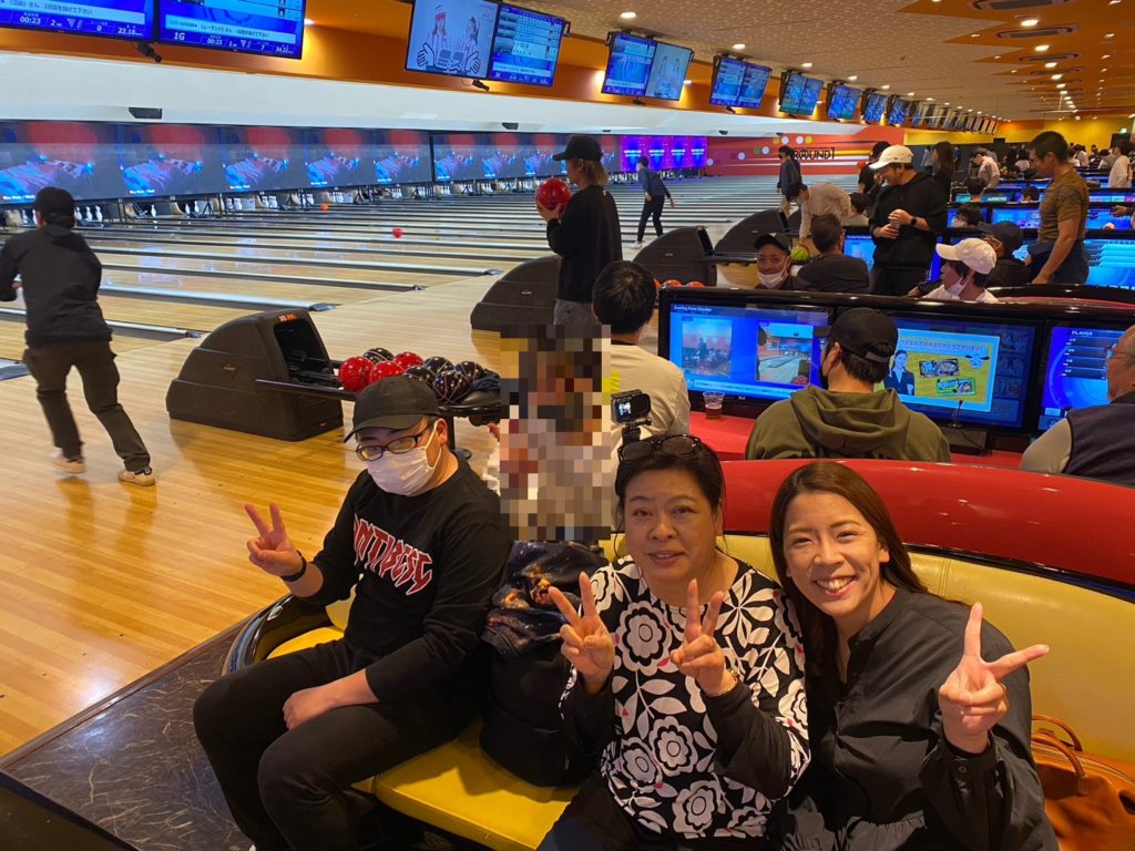 奥さんと娘が偶然にも同じチームになりました。お酒を飲みながらの慣れないボーリングですが楽しむことをモットーに!!