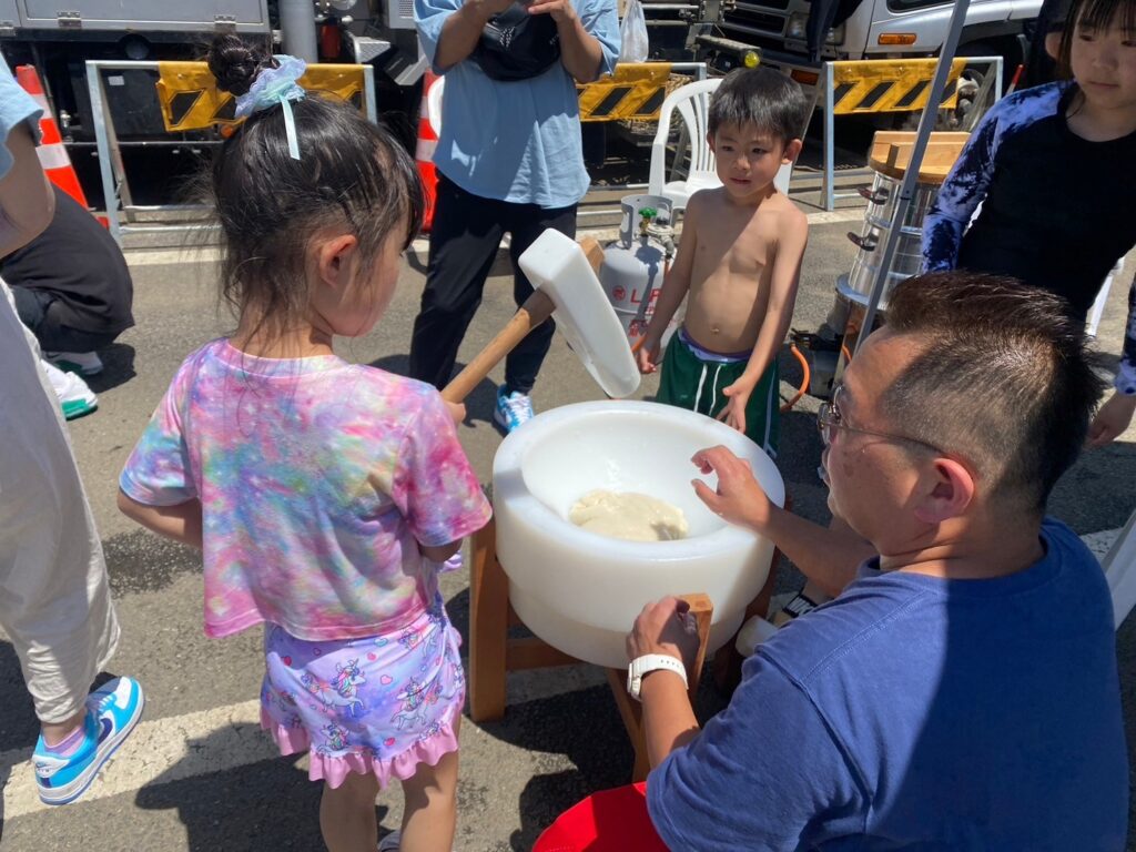 全体写真を撮り忘れてしまった・・・今年は社長のご厚意で家族だけでなく友人の招待もOKとなりました。いつもは作業車両で溢れる資材置場ですが、この日の為に車を大移動して綺麗に整理整頓。広々空間になったので子供達は大興奮し、ボール遊びや水遊びに宝探しなどしておおはしゃぎ。メインディッシュはみんなで作ったつきたてのお餅で今回も最高の出来でした。きなこ、黒ゴマ、納豆、おろし、あんこ、醤油海苔でバラエティもGOOD。けんちん汁も作ってとても美味しかったです。BBQ陣営もウインナーや焼き鳥などとにかく肉の量が凄かった。野菜との対比は9:1です。(笑)いつも買い過ぎる傾向がありましたがなんとか食べきりホッとしました。また和気あいあいとやりましょう。