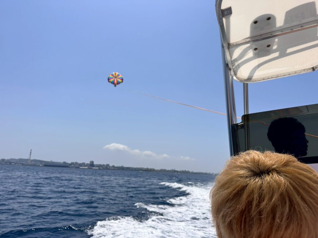 マリンスポーツの頂点?!パラセーリングに挑戦しました。結構な高さまであがると正直怖かったですとのこと。澄んだ綺麗な海と晴天に恵まれて景色は最高峰でした。来年もリピート確定だね。