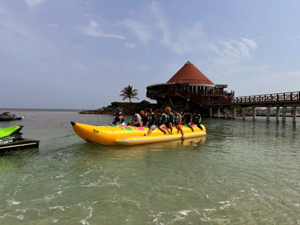 エンジョイ!マリンスポーツでバナナボート。大人数で乗れるタイプでかなり安定していました。いつも落としあいを始めちゃう僕達ですが他のお客さんもいて自粛しました。(笑)