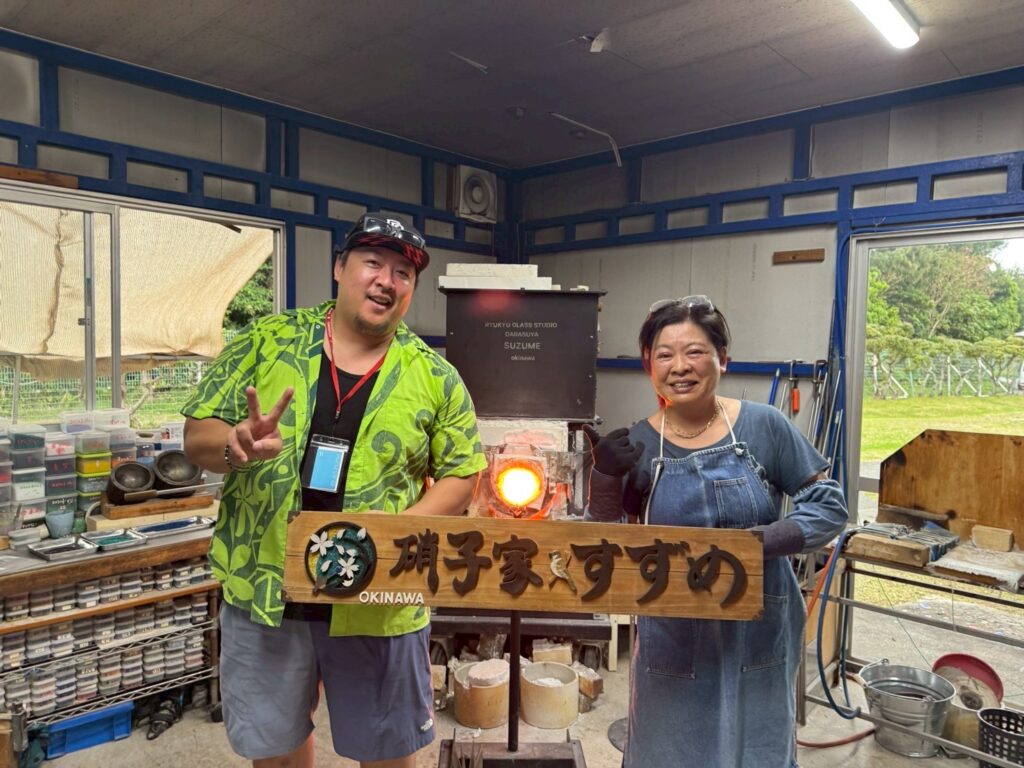 体験工房の代表といえば吹きガラスを思い浮かべますね。綺麗なガラス細工を1500℃近くなる高温の窯に回しながら出し入れし、色付けしたり吹きかたを工夫すると色々な形や泡が入ったりします。このグラスで飲むビールは絶品確定ですね。
