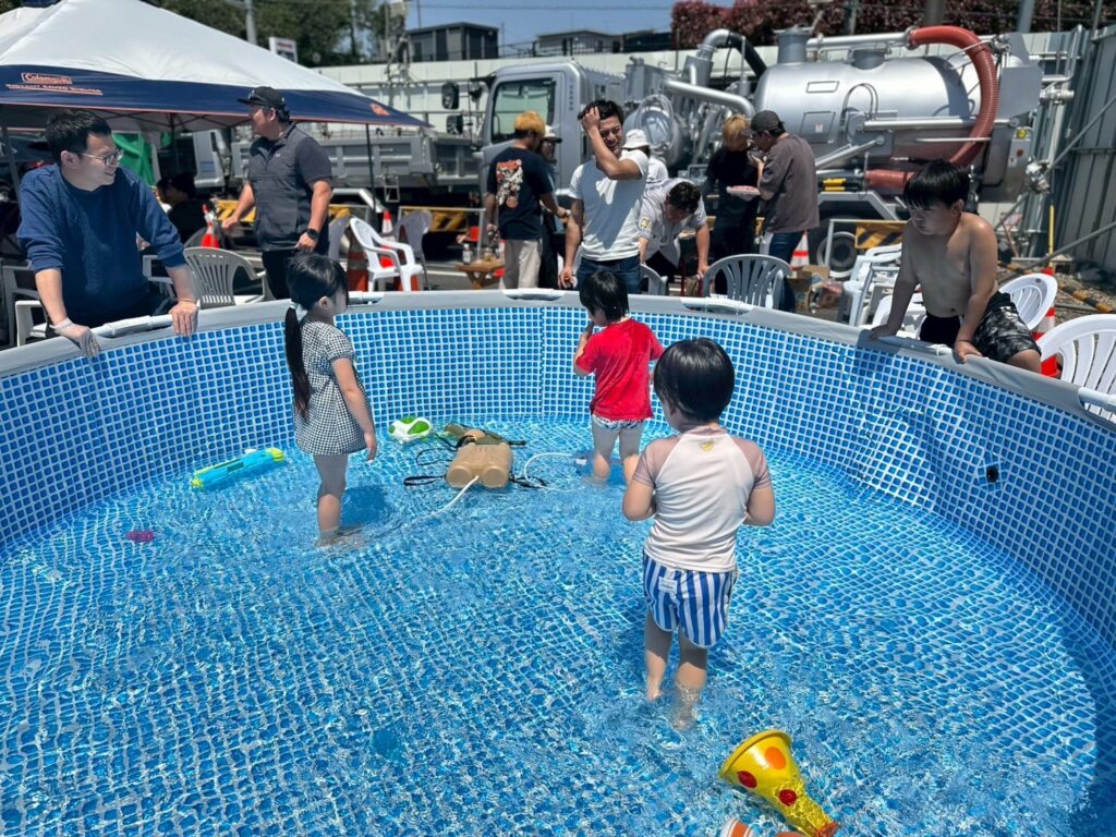 子供たちが飽きないように大きいプールを設営しました。日差しが強くテントも張って快適に過ごせました。子供たちに水鉄砲を浴びせられる大人たちはとても冷たく感じました。