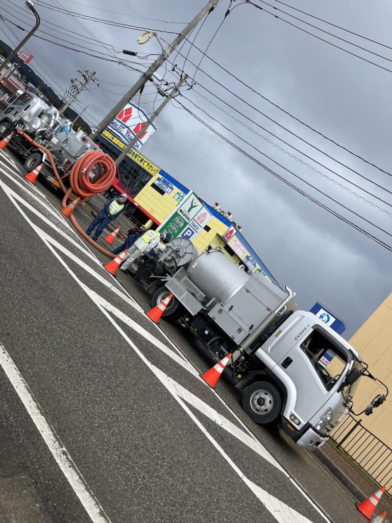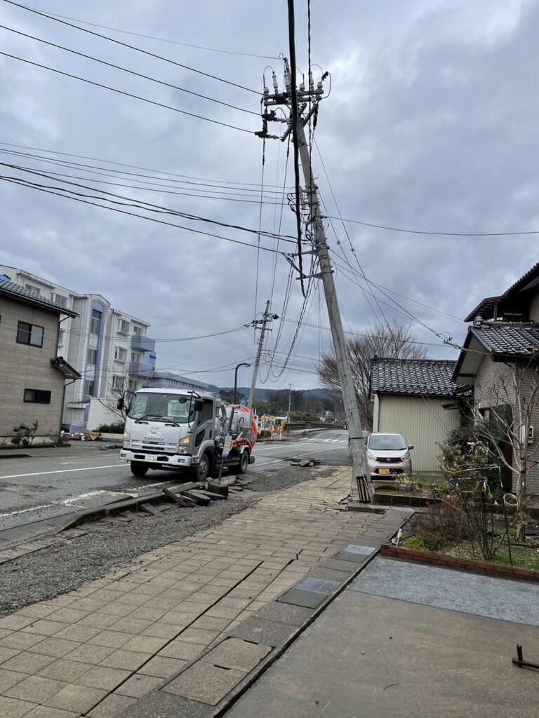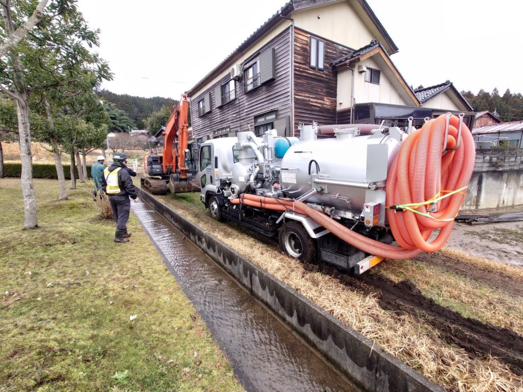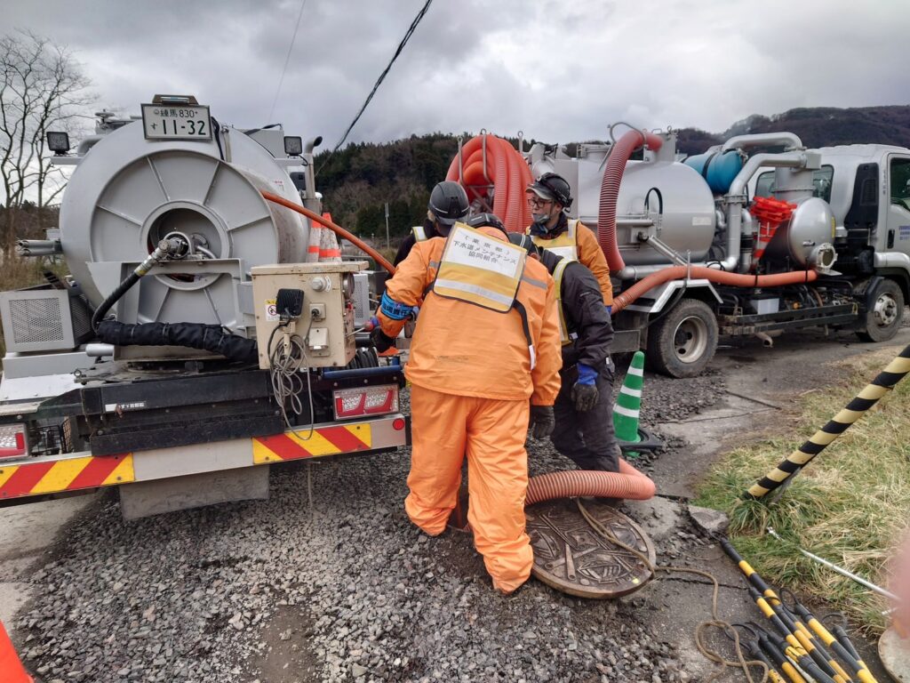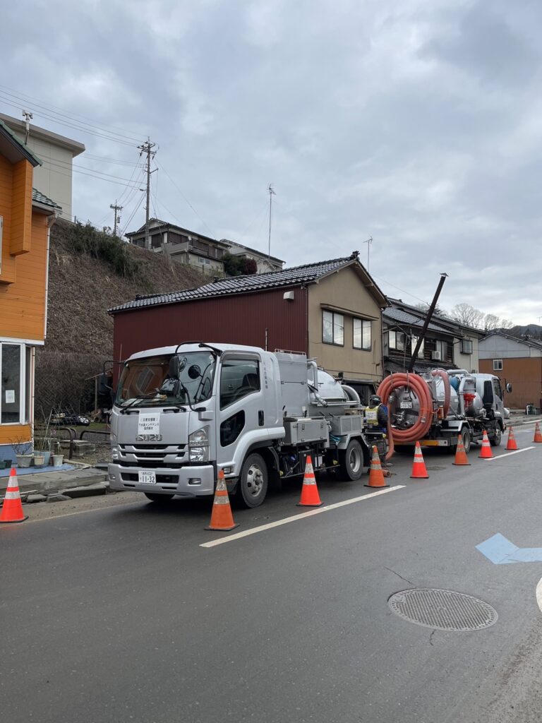 現地での作業状況をお伝えします。現地では目まぐるしく日々の環境が変化しました。天気は1日だけ晴れ間がありましたが、雪や雹と雨がほとんどでした。道路状況は悪く、集合場所までの道も悪路が続きます。現場ではマンホールの隆起や道路陥没箇所が見受けられました。車両移動・配置時は最善の注意が必要です。街中を歩いている人はほとんど見受けられず、様々な復興支援団体であろう作業の恰好をしている人達とすれ違いました。一般人が出歩いていないので保安帯の的確な設置よりも優先的に実務を遂行出来ました。担当した作業箇所のマンホール内部は思ったより酷い状況が少ない印象でしたが、流入土砂が100%詰まっている箇所も見受けられ、我々の力で取り除くことが出来てホッとしています。輪島市の被害状況からすると本当に微力ではあると思いますが助太刀出来たことを嬉しく思います。僕達が日々活動しているのは東京都内ですが、いつどこで都市直下型の地震が来るかわかりません。その時は同じように日本全体で助けに来てくれると信じたいです。